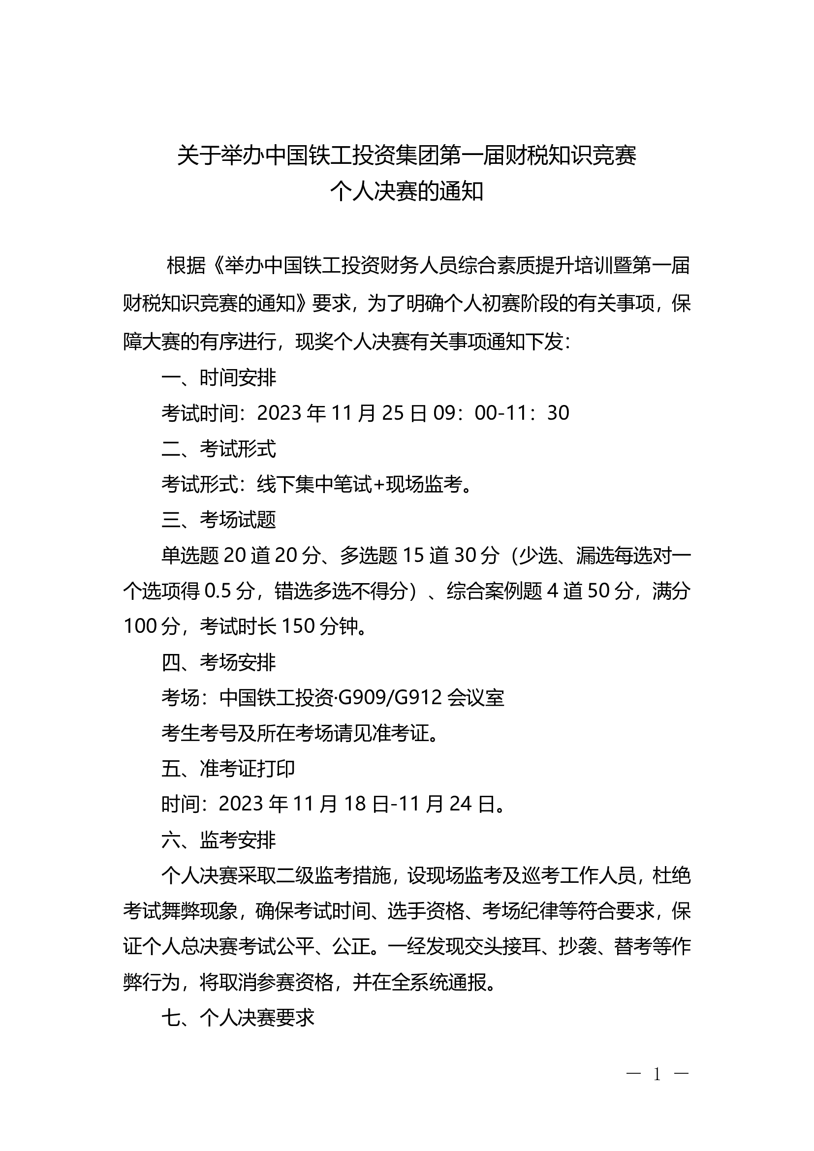 关于举办中国铁工投资集团第一届财税知识竞赛 个人决赛的通知