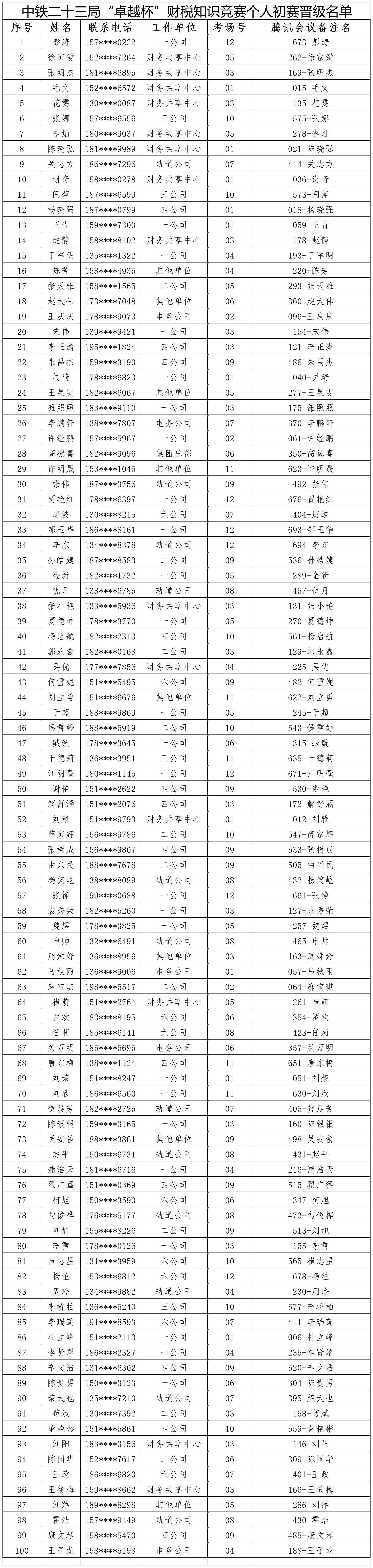 【晋级名单】中铁二十三局“卓越杯”财税知识竞赛个人初赛晋级名单
