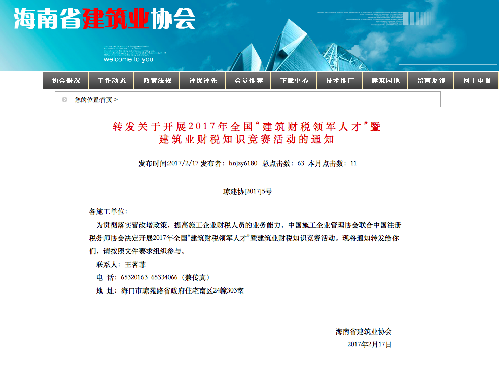 【海南省建筑业协会】关于开展2017年全国“建筑财税领军人才” 暨建筑业财税知识竞赛活动的通知