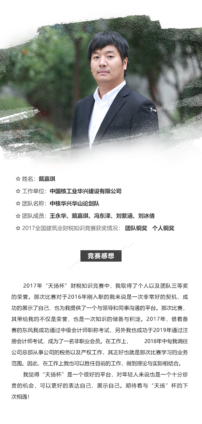 2017年“天扬”杯财税知识竞赛中,我取得了个人以及团队三等奖的荣誉。那次比赛对于2016年刚入职的我来说是一次非常好的契机
