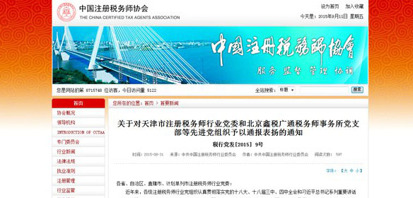 关于对天津市注册税务师行业党委和北京鑫税广通税务师事务所党支部等先进党组织予以通报表扬的通知