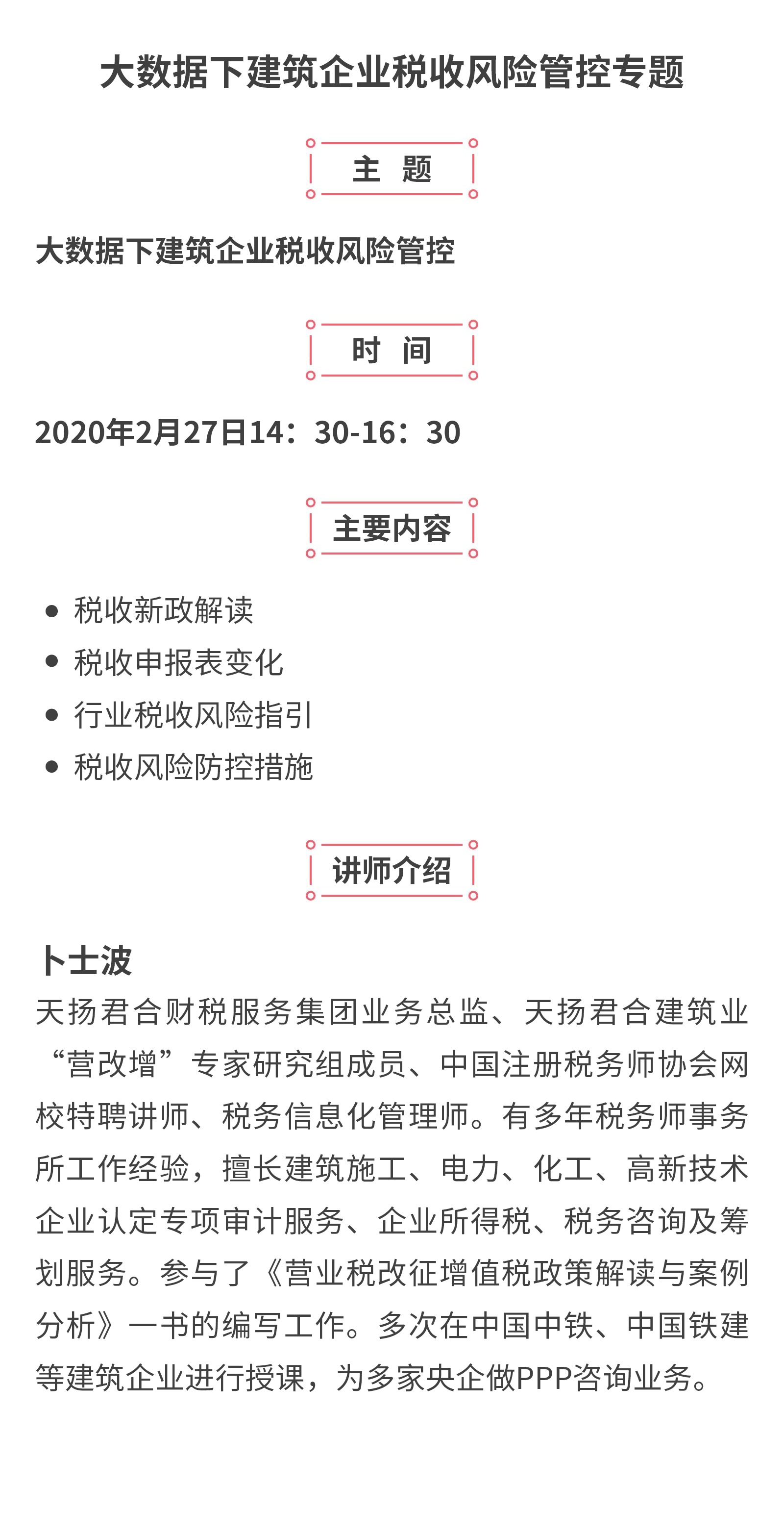 天扬君合财税咨询集团业务总监 天扬君合建筑业“营改增”专家研究组成员 中国注册税务师协会网校特聘讲师 天扬君合建筑业“营改增”专家研究组成员。有多年税务师事务所工作经验,擅长建筑施工、电力、化工、高新技术企业认定专项审计服务、企业所得税、税务咨询及筹划服务。参与了《营业税改征增值税政策解读与案例分析》一书的编写工作。多次在中国中铁、中国铁建等建筑企业进行授课。为多家央企做PPP咨询业务。